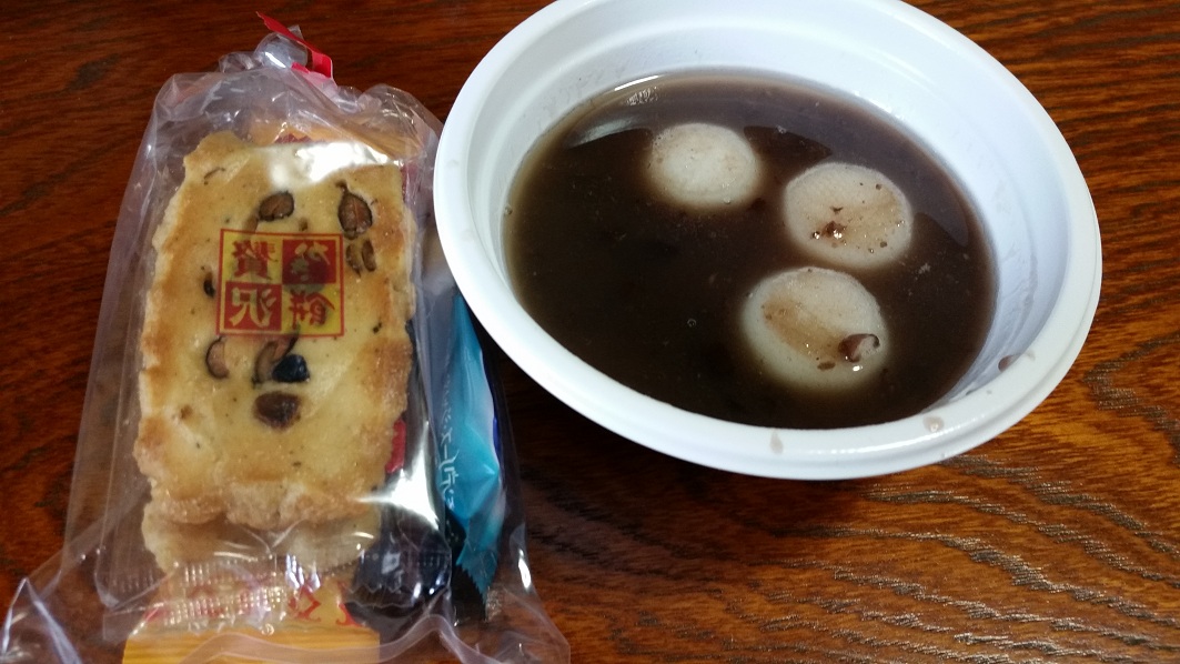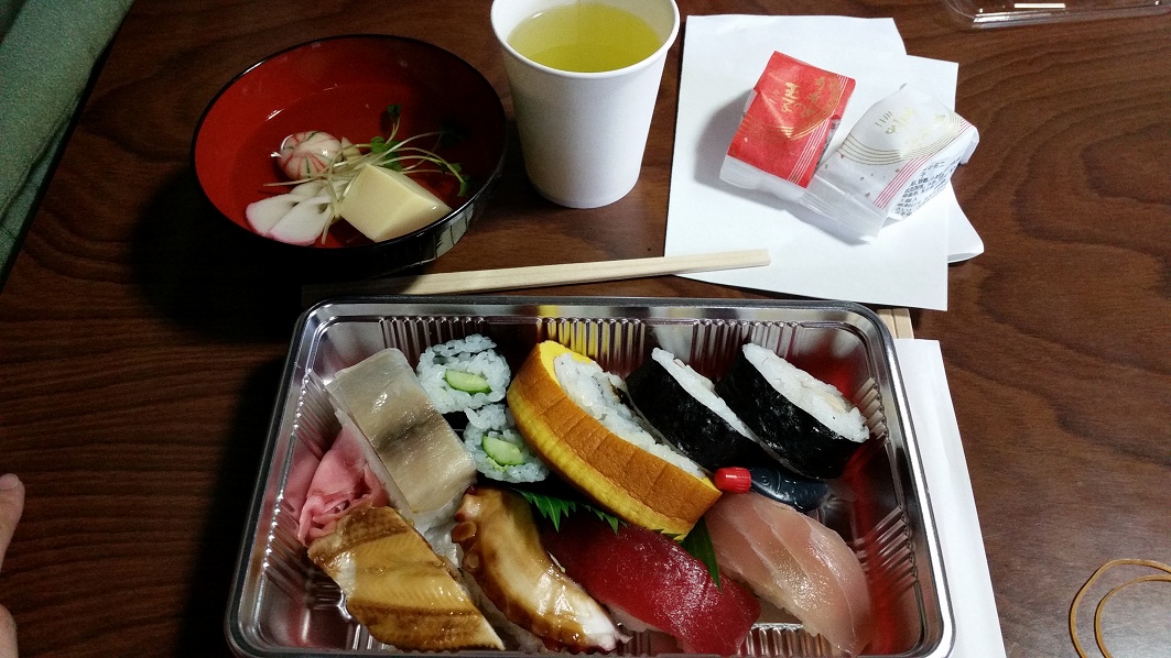 お茶、お寿司、お吸い物、和菓子、お汁粉、お菓子、みかん…